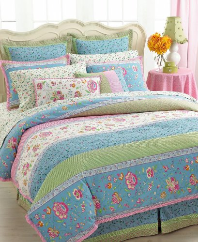 Tommy Hilfiger Emma collection features all over multicolor floral print sheets, a floral pieced comforter is a modern translation of a traditional all American quilt. The comforter reverses to a green foulard print. The Standard and King shams feature large aqua florals with quilted stripes and flange. The European Sham is an all over floral with a quilted flange. The dust ruffles are pieced floral quilted stripe and quilted floral. Decorative pillows add the finishing touch to this countryside bedding ensemble. Coordinating window treatments feature pole top design in the drapes and window valance, also available are coordinating Bath ensemble.